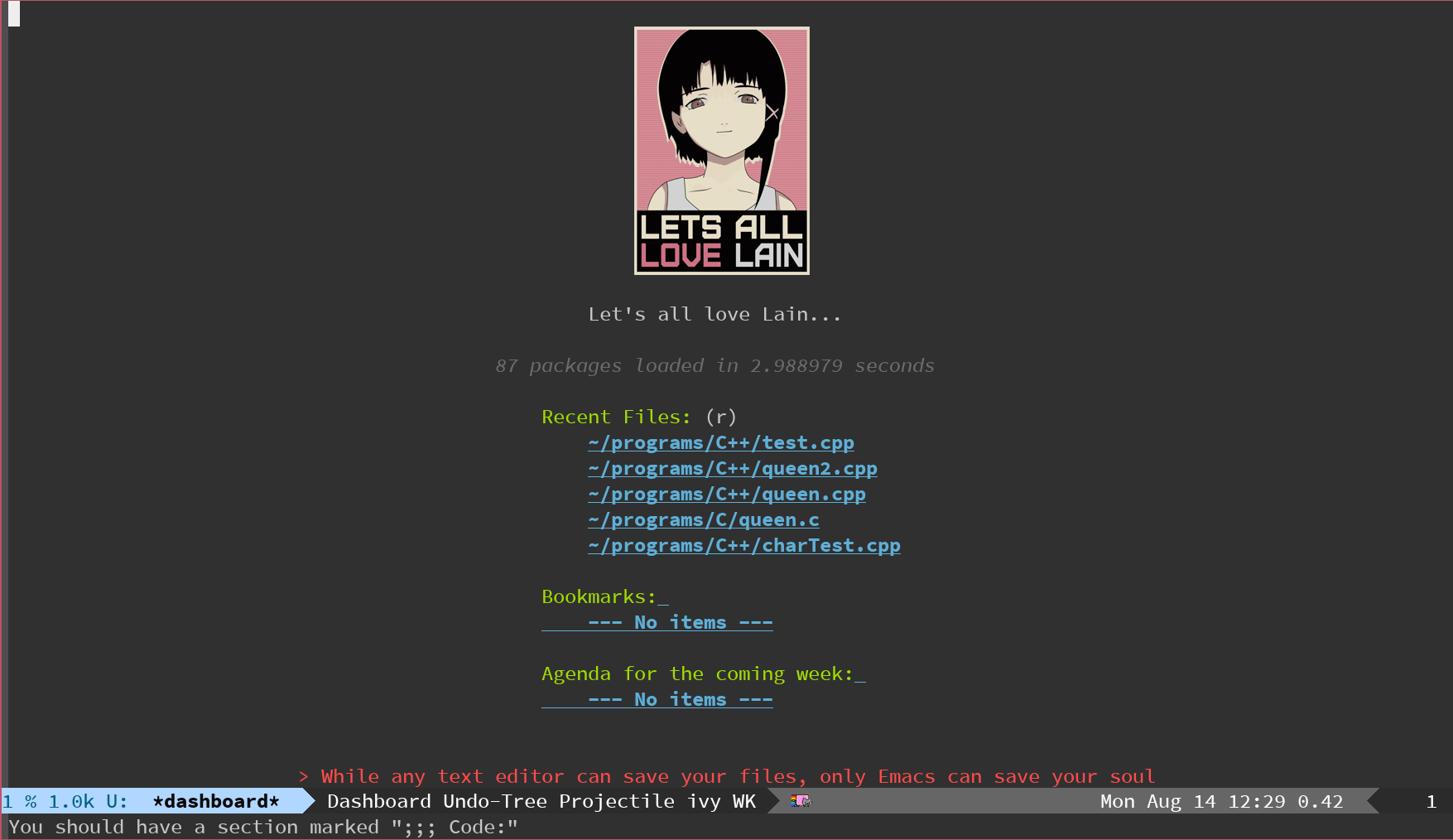 用惯了Emacs下的dashboard,我还是喜欢在编辑器启动的时候显示一些有用的信息: