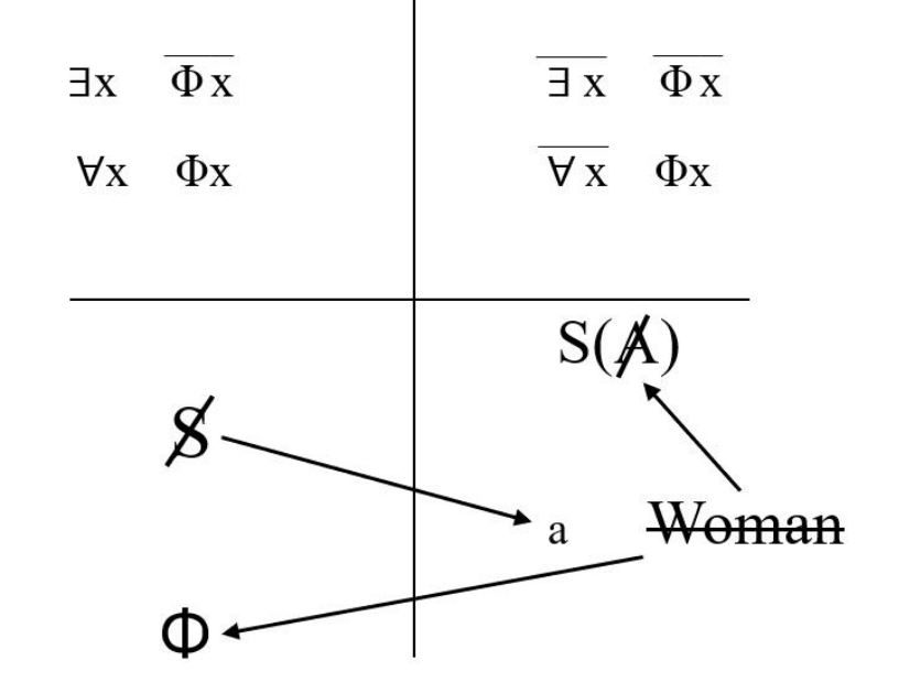 到这里,我们看到了两类形象——男性和女性。那么下面发生了什么呢?首先我们关注右下角的划线的Woman,这说明什么?这说明女性是不存在的。哈!好武断的论据!这对吗?!!其实没有任何问题。还记得我们之前提到,这里的女性是哲学意义的女性吗?女性可以选择在不受菲勒思的支配,这带给了她们一定程度的自由,而这也摧毁了女性这一身份认同的基础,女性的交集是空集,即每个女性都可以选择自己的道路,千奇百态。所以女性是不存在的。