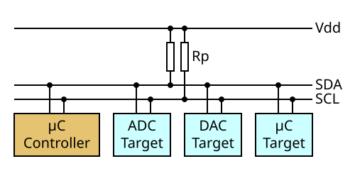 SCL控制着「何时该读取信号」,由主设备控制。比如在单片机上,SCL通常是由单片机来控制的。当SCL为高电平时读取数据。在上图中,就是由微控制器控制。